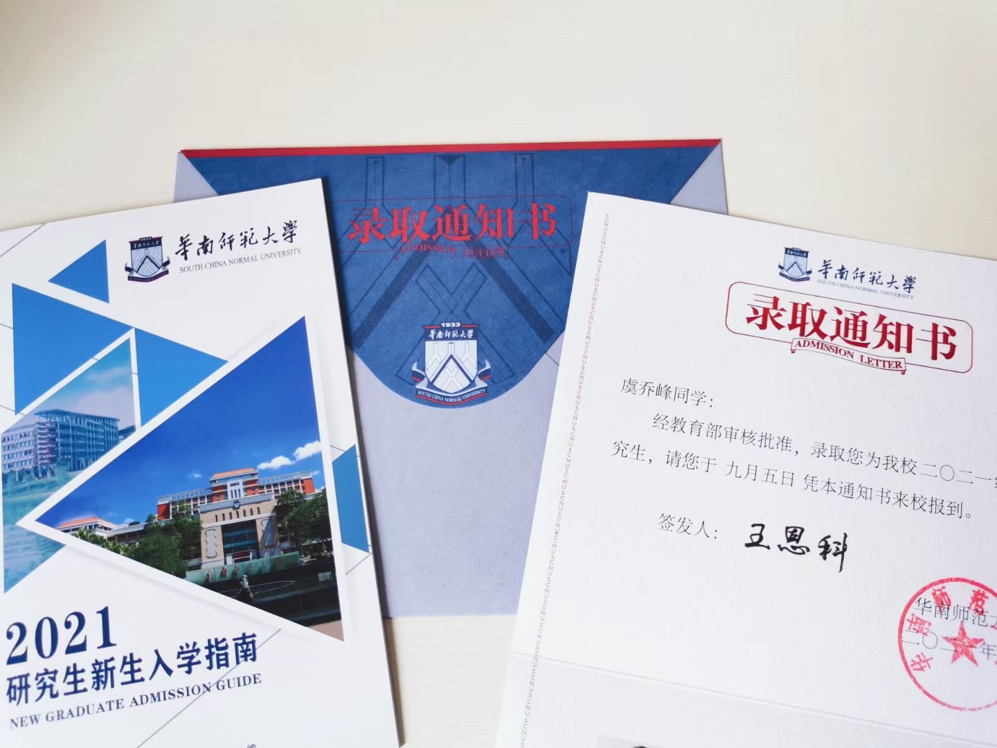 最终,考研笔试成绩揭晓,虞乔峰进入复试。经过创业、部队的锻炼,虞乔峰相比于一般的同学有更丰富的人生经历,面试过程更能够结合理论和思考,从生活和实践的角度回答问题,得到考官的好评。最终,考研成绩揭榜,虞乔峰入围顺利成为一名华南师范大学法学院硕士。