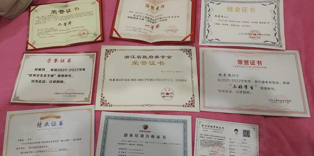 踏入义乌工商职业技术学院的那一刻,林展鸿为自己设定了“三棱镜式成长模型”:思想高度、专业深度、实践广度三者缺一不可。作为首批递交入党申请的学生,他积极参加各种志愿者活动去帮助同学,面对疫情仍然毫无怨言冲锋在一线;作为班长,他团结班内同学,认真学习当好表率,积极协助老师完成各项工作;作为创新创业团队核心成员,他和伙伴们征战“挑战杯”,当省赛金奖证书握在手中时,林展鸿更加确信:人生的主动权,永远属于敢想敢为的行动派。