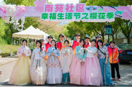 3月30日下午,江东街道南苑社区樱花烂漫,一场别开生面的幸福生活节活动在此举办。此次活动由社区党委牵头,并特邀义乌工商职院“校史育人·思成筑梦”志愿服务小分队共同参与,为居民们带来了一场视觉与心灵的盛宴。